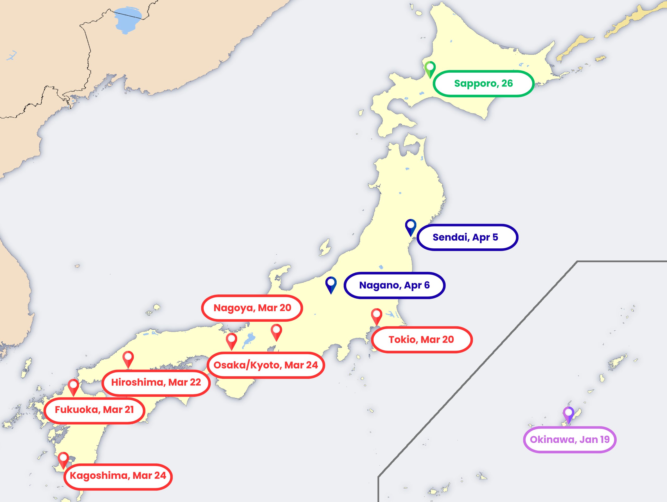 Kwitnienie sakury postępuje z południa na północ, więc różnice między regionami mogą wynosić kilka tygodni. Poniższa mapa przedstawia typowy przebieg sezonu.