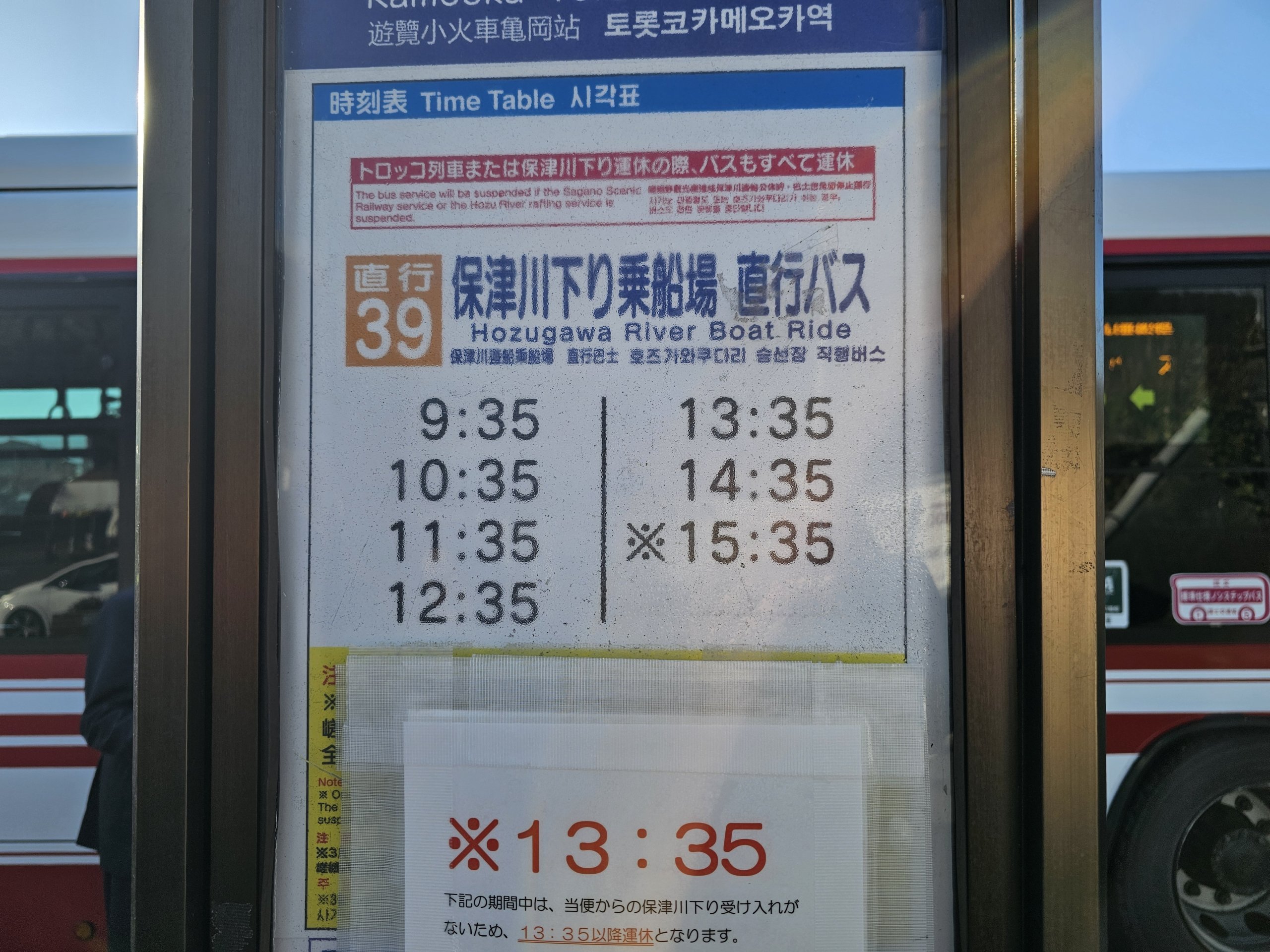 Z romantycznego pociągu Sagano autobus linii 39 kursuje bezpośrednio do przystani, łącząc się z każdym pociągiem, a czas podróży wynosi około 10 minut. Za przejazd autobusem można zapłacić gotówką lub kartą transportową (ICOCA, Suica lub inną).