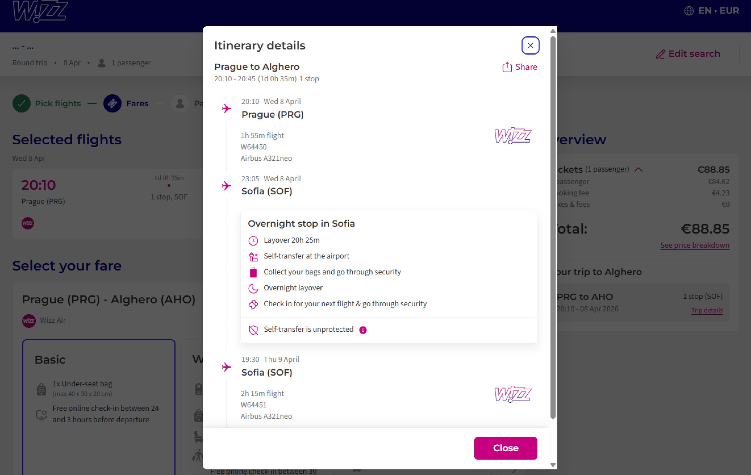 - ❌ jeśli jeden lot zostanie odwołany lub zmieniony (przez Wizz Air), nie masz prawa do korekty drugiego lotu.
