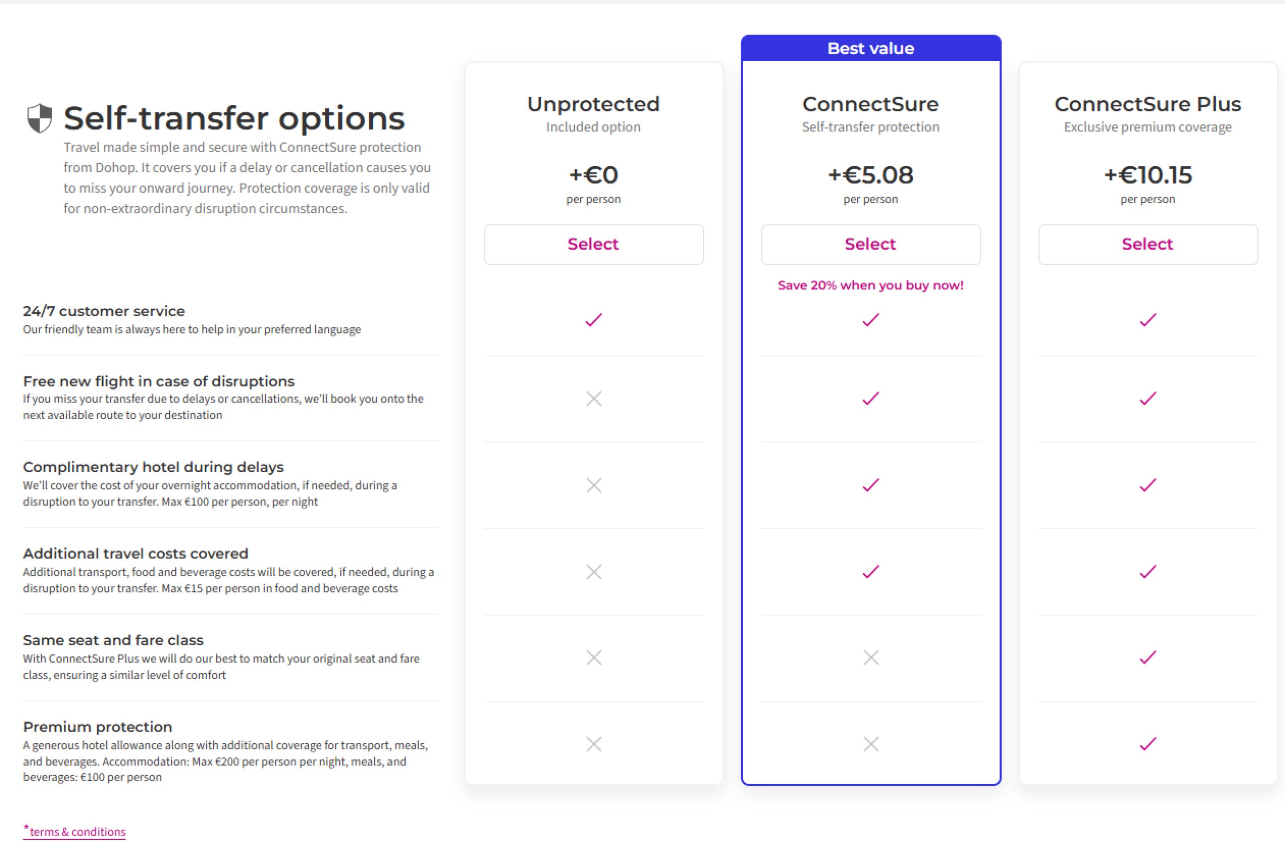 Jeśli chcesz mieć zagwarantowany lot z przesiadką, wraz z biletami musisz wykupić usługę ConnectSure, którą wybiera się podczas procesu rezerwacji lotu.