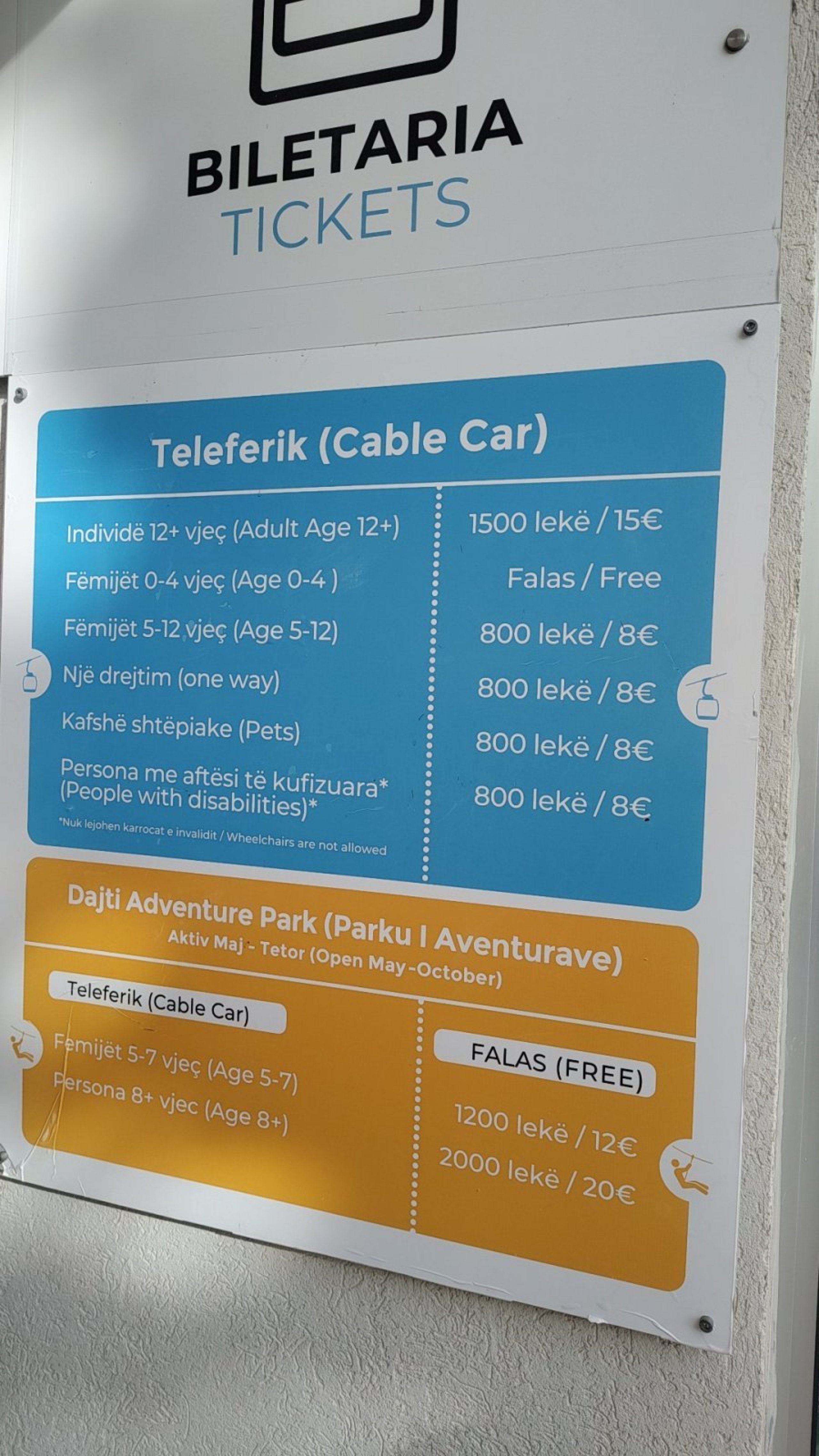 Aby wyjaśnić od listopada 2025 r. - cena biletu w obie strony wynosi 1500 Lek, czyli około 385 CZK. Kolejka linowa mówi, że jazda trwa 15 minut, w rzeczywistości jest to około 19 minut - to naprawdę długa jazda, a jeśli pogoda jest ładna, widok też jest ładny. Lepiej wybrać się rano, jest mniej tłoczno. Autobus publiczny zatrzymuje się pod wejściem do Bunk'Art 1 (jeśli najpierw pójdziesz do bunkra, tak jak my, zapytaj kasjera, a zatrzyma się tuż przy wejściu). Od bunkra do kolejki linowej idzie się chodnikiem, a po około 250 metrach skręca w prawo pod górę, a następnie kontynuuje przez około 300 metrów (jest to oznaczone znakami). W drodze do stacji kolejki linowej natkniemy się na mały sklep na rogu, w którym można kupić schłodzone napoje itp. Cena za 1,5 litra czegoś brzoskwiniowego (podobnego do Fanty) wynosiła chyba 140 Lek, czyli około 35 CZK.