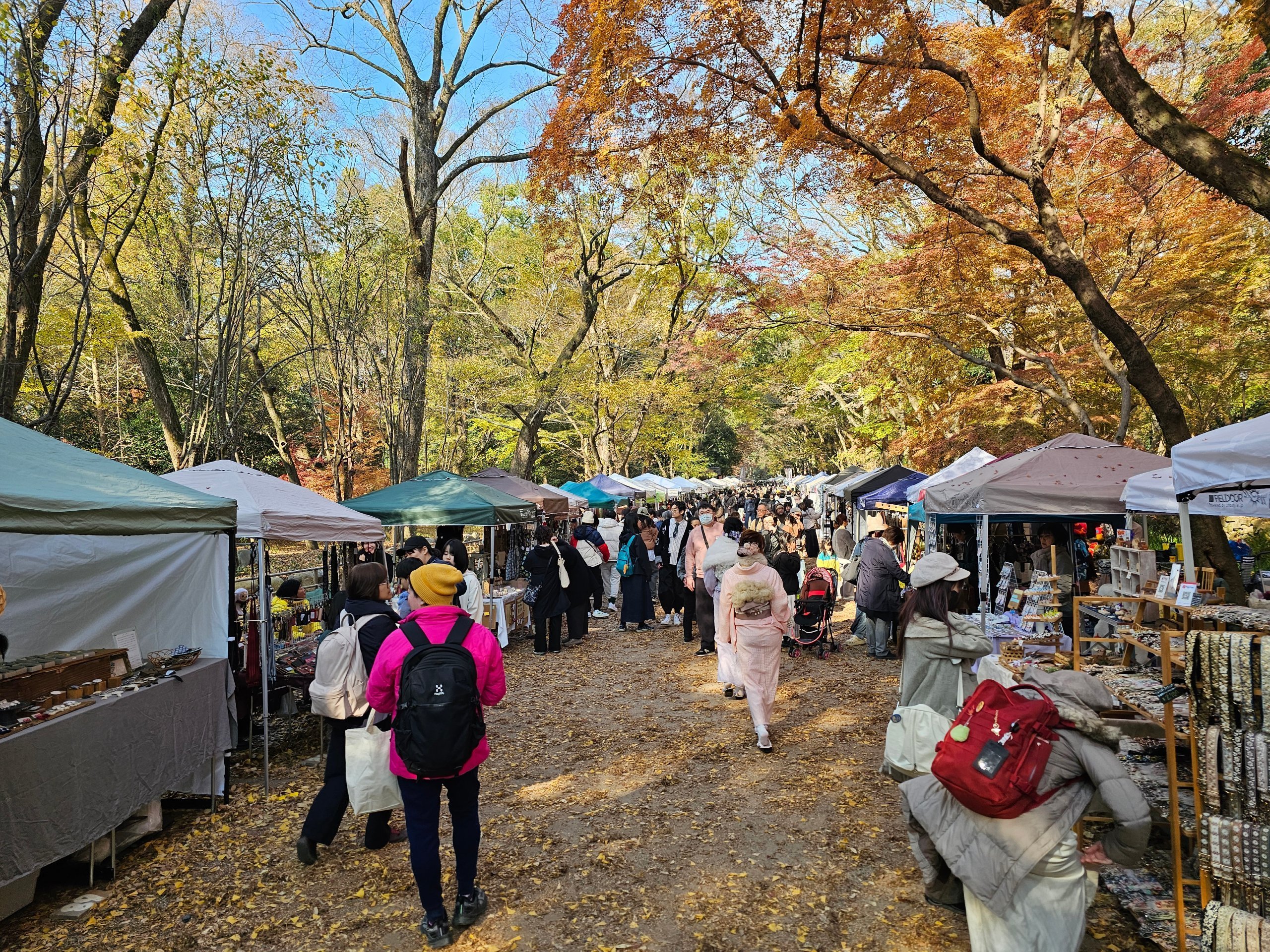 Ścieżka spacerowa pełna straganów z pamiątkami biegnie przez las Tadasu no Mori.