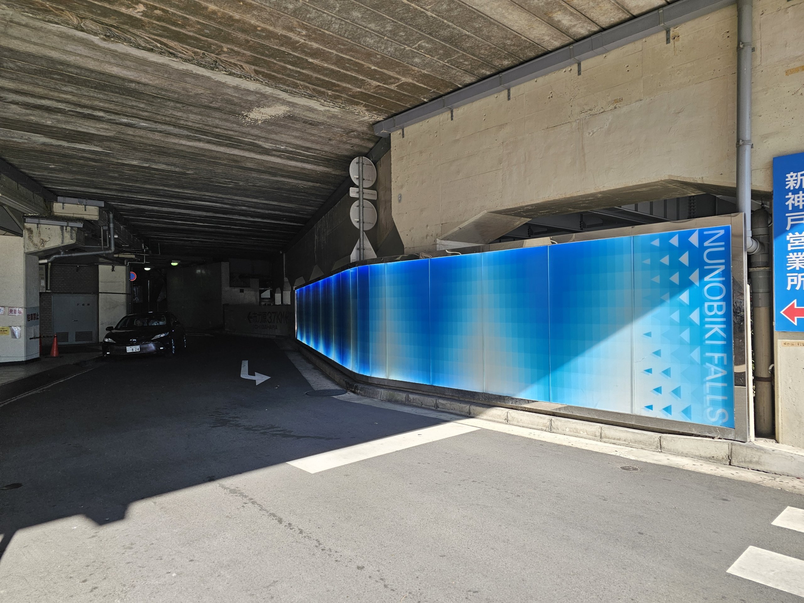 Najpierw należy przejść przez przejście podziemne pod stacją, które jest oznaczone kolorem niebieskim i napisem "Nunabiki Falls".
