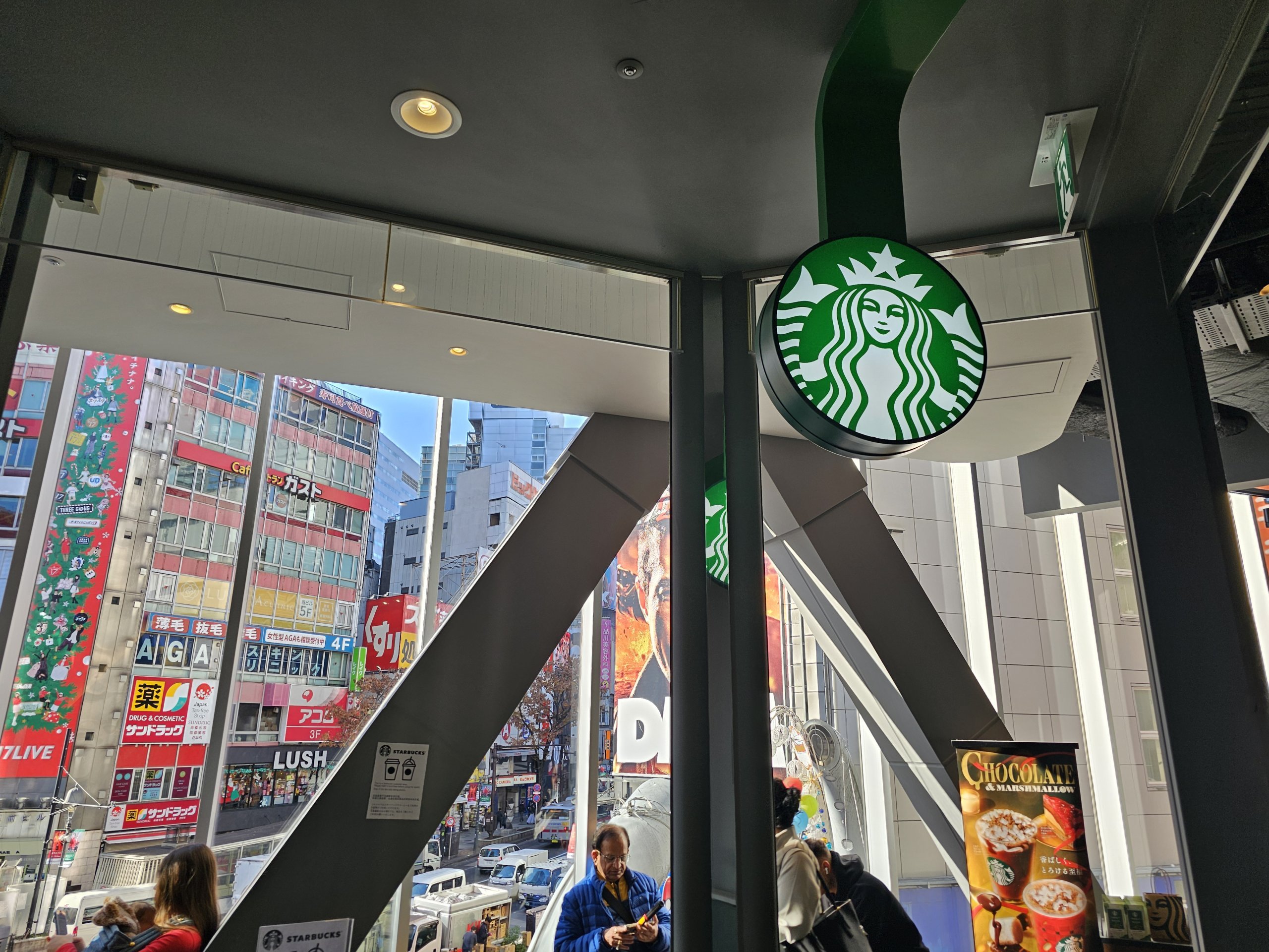 Jest stąd ładny widok na skrzyżowanie Scramble, ale mimo że platforma widokowa znajduje się na zewnątrz, szkło jest wysokie, więc i tak nie można uzyskać wyraźnego ujęcia bez szkła.