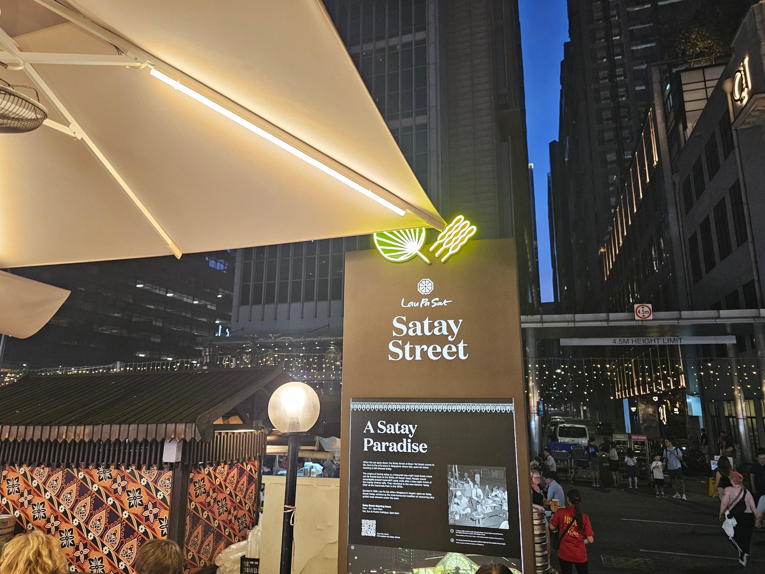 W ciągu dnia Lau Pa Sat jest raczej zwykłą stołówką dla pracowników biurowych. Prawdziwa atmosfera pojawia się wieczorem, kiedy otwiera się Satay Street.