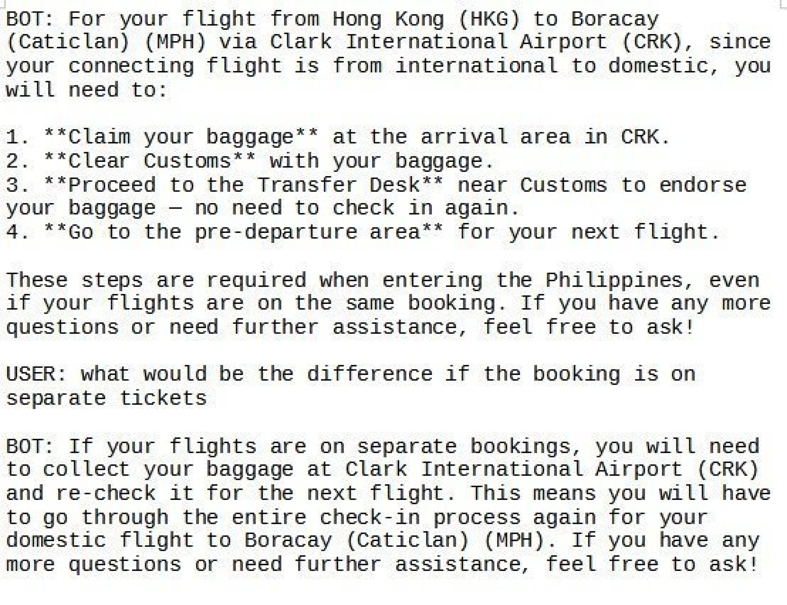 Cześć, pytałem o coś podobnego na czacie, lecę w lutym. Moje loty są na jednej rezerwacji i aby uniknąć Manili, lecę przez Clark z 3-godzinnym postojem. Odprawię się online. Zapisałem transkrypcję czatu z BOT, w załączeniu.