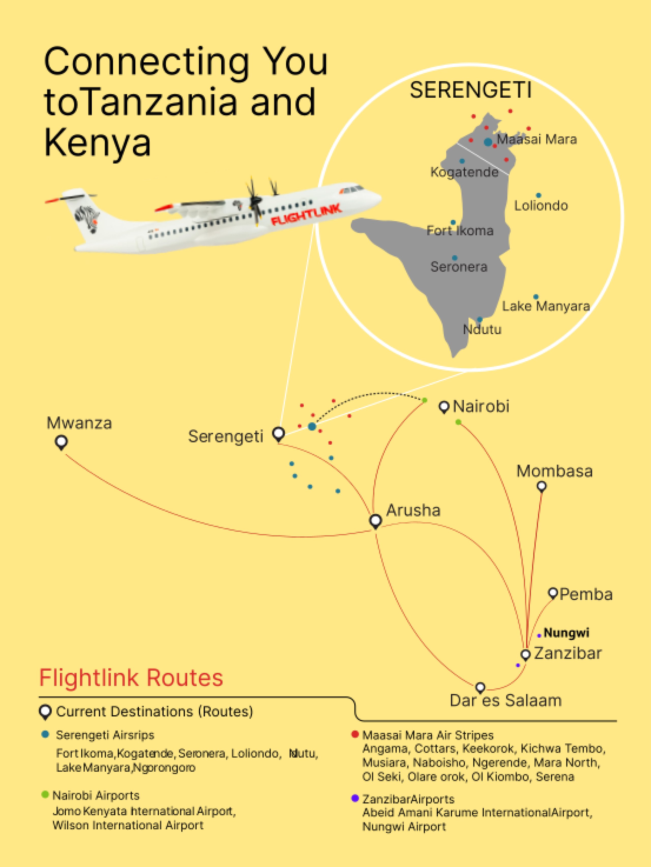 Flighlink koncentruje się na łączeniu głównych miejsc turystycznych w Tanzanii z największym miastem , Dar es Salaam.