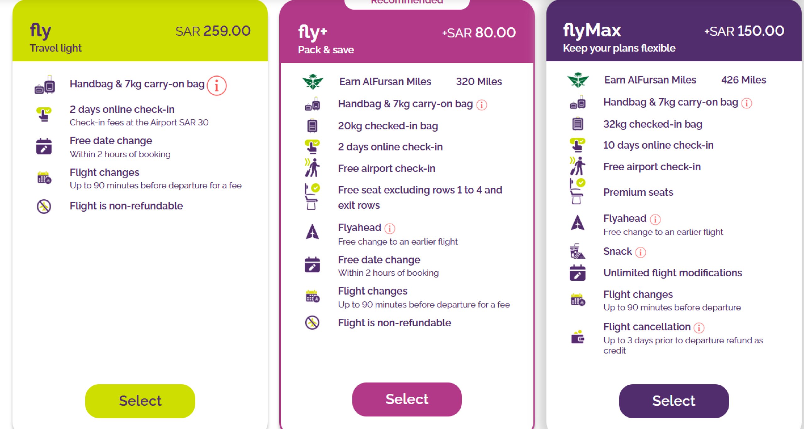 Flyadeal oferuje tylko klasę ekonomiczną podzieloną na 3 różne grupy taryfowe.