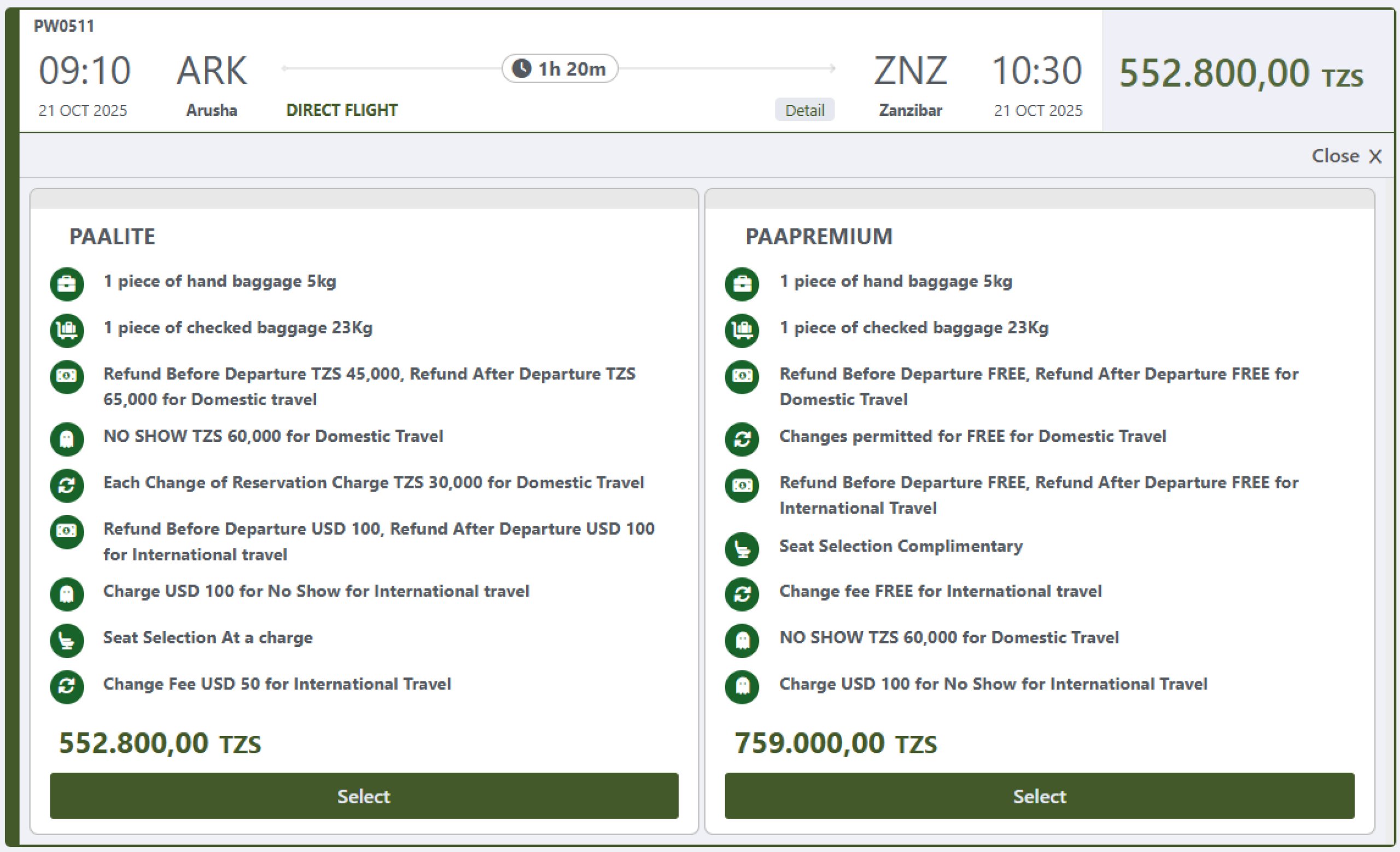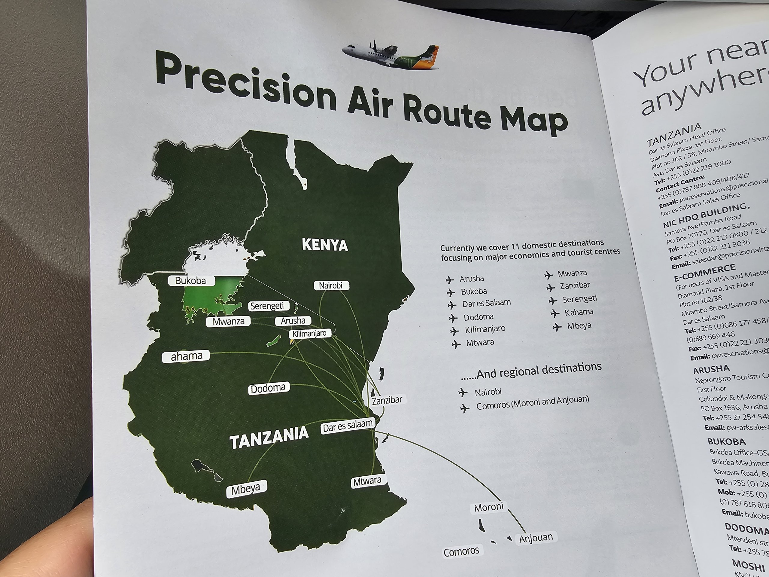 Precision Air to sieciowe linie lotnicze oferujące loty z przesiadkami na lotniskach Dar es Salaam DAR lub, Kilimandżaro JRO lub Zanzibar ZNZ.