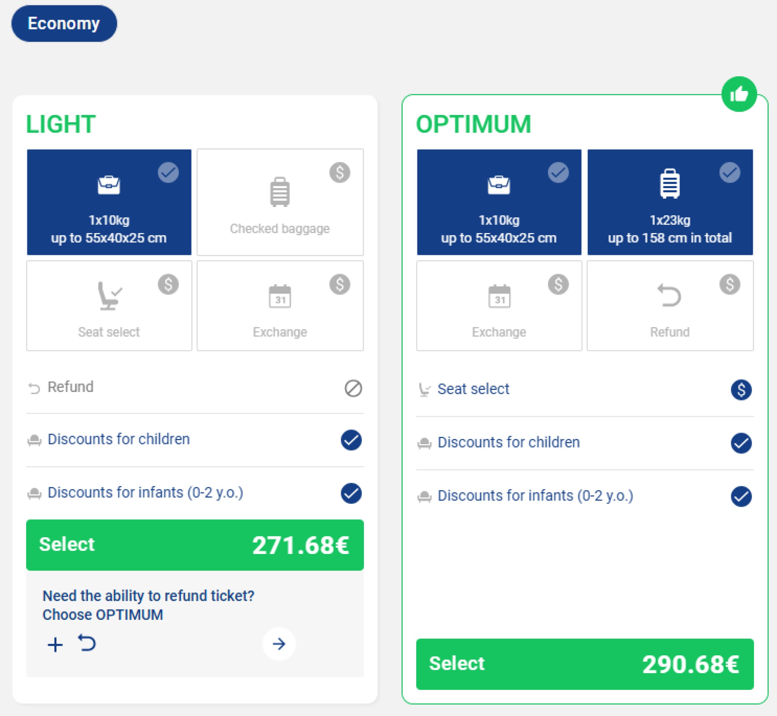 - Light - Tylko bagaż podręczny, wybór miejsca za opłatą, zmiany i anulacje nie są dozwolone.