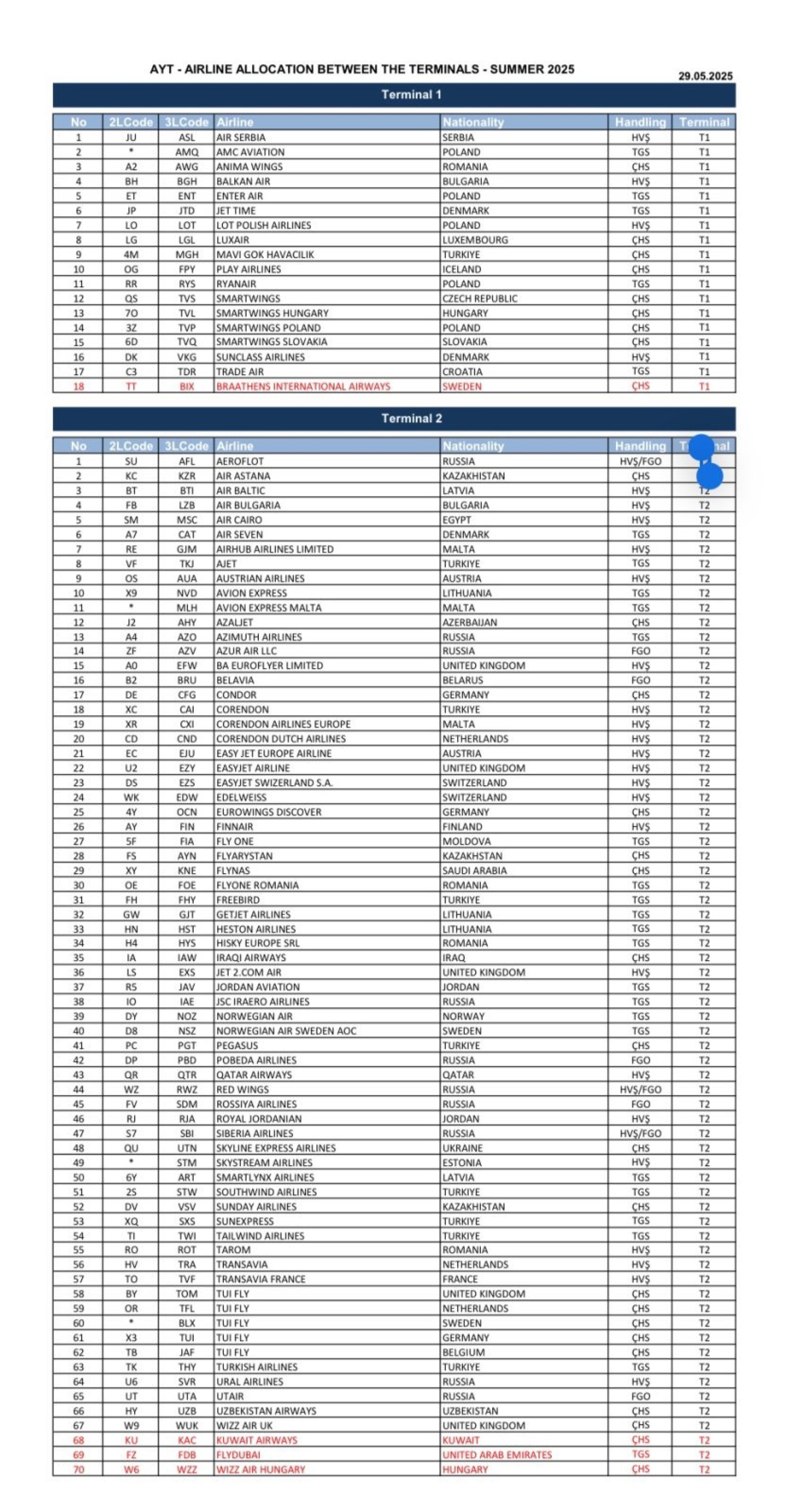 - Terminal 2 - Air Astana, airBaltic, Air Cairo, Bulgaria Air, AJet, Austrian, Avion Express, British Airways, Condor, Corendon Airlines, easyJet, Edelweiss Air, Eurowings, Finnair, FlyOne, Fly Arystan, Flydubai, Flynas, Freebird Airlines, GetJet Airlines, Heston Airlines, Hisky, Iraqi Airways, Jet2.com, Jordan Aviation, Kuwait Airways, Norwegian, Pegasus Airlines, Qatar Airways, Royal Jordanian, Skyline Express Airlines, Smartlynx Airlines, Southwind Airlines, Sunday Airlines, SunExpress, Tailwind Airlines, Tarom, Transavia, Tui Fly, Turkish Airlines, Uzbekistan Airways, Wizz Air.