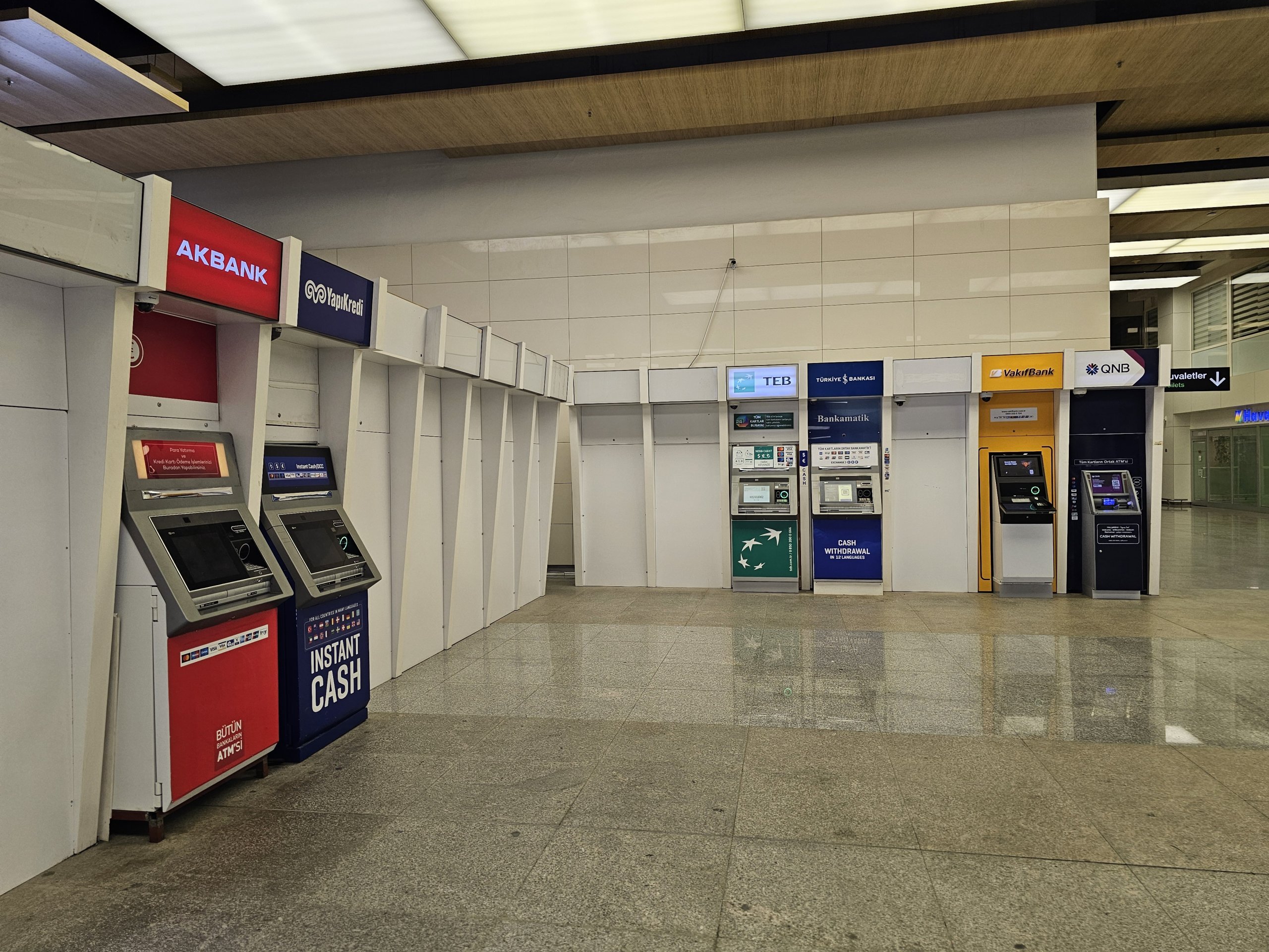 Bankomaty zwykłych tureckich banków znajdują się w wielu miejscach w halach przylotów obu terminali.