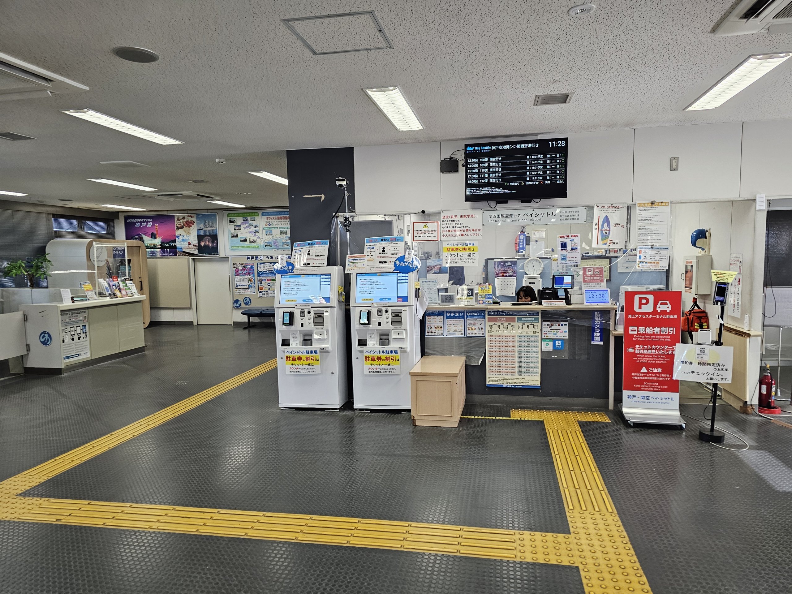 Bezpłatny autobus łączący terminale 1 i 2 zatrzymuje się w doku i łączy się ze wszystkimi promami, zobacz szczegółowy rozkład jazdy: kobe-access.jp