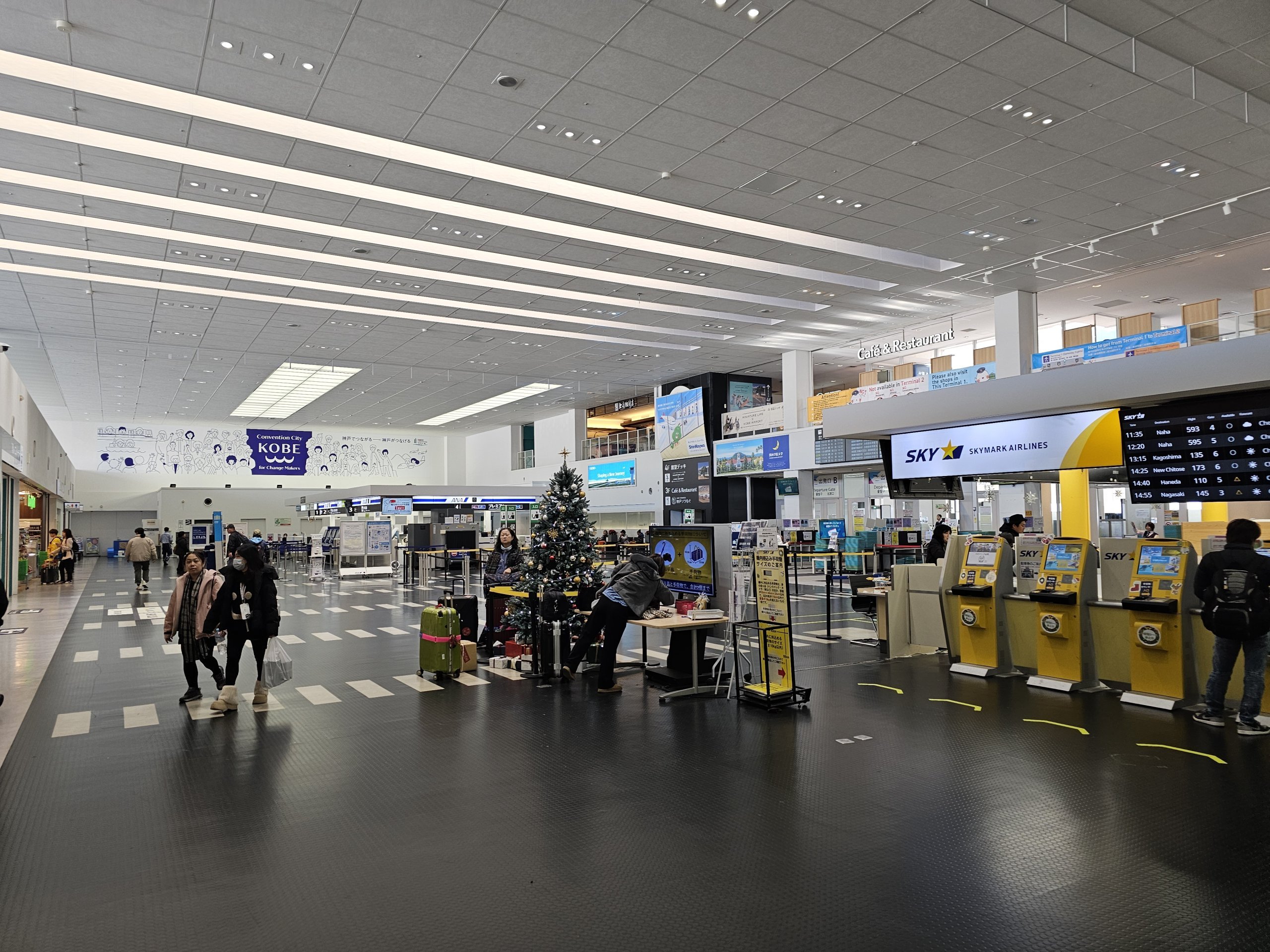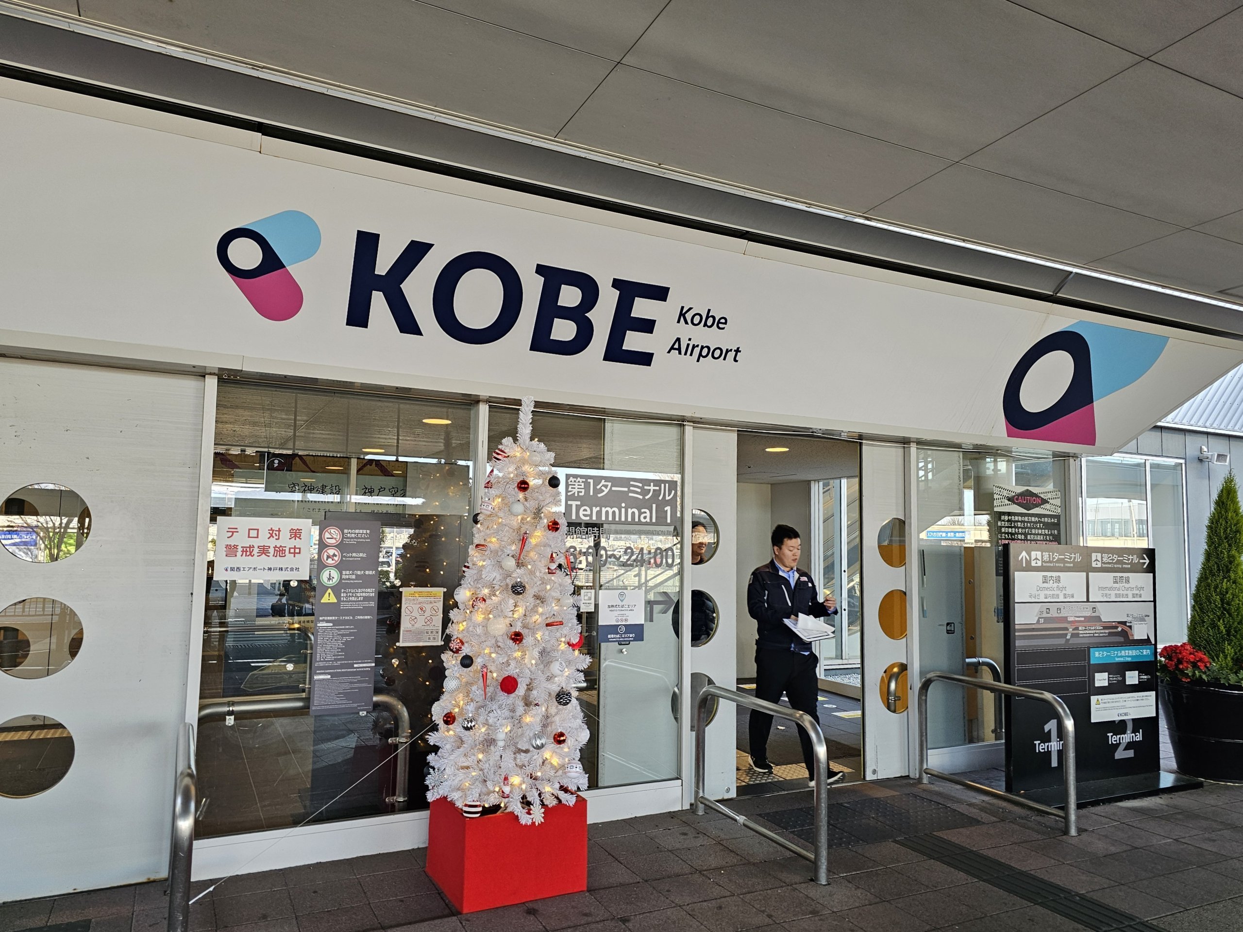 Lotnisko Kobe ma 2 małe, dobrze zorganizowane terminale w oddzielnych budynkach oddalonych od siebie o około 400 metrów.