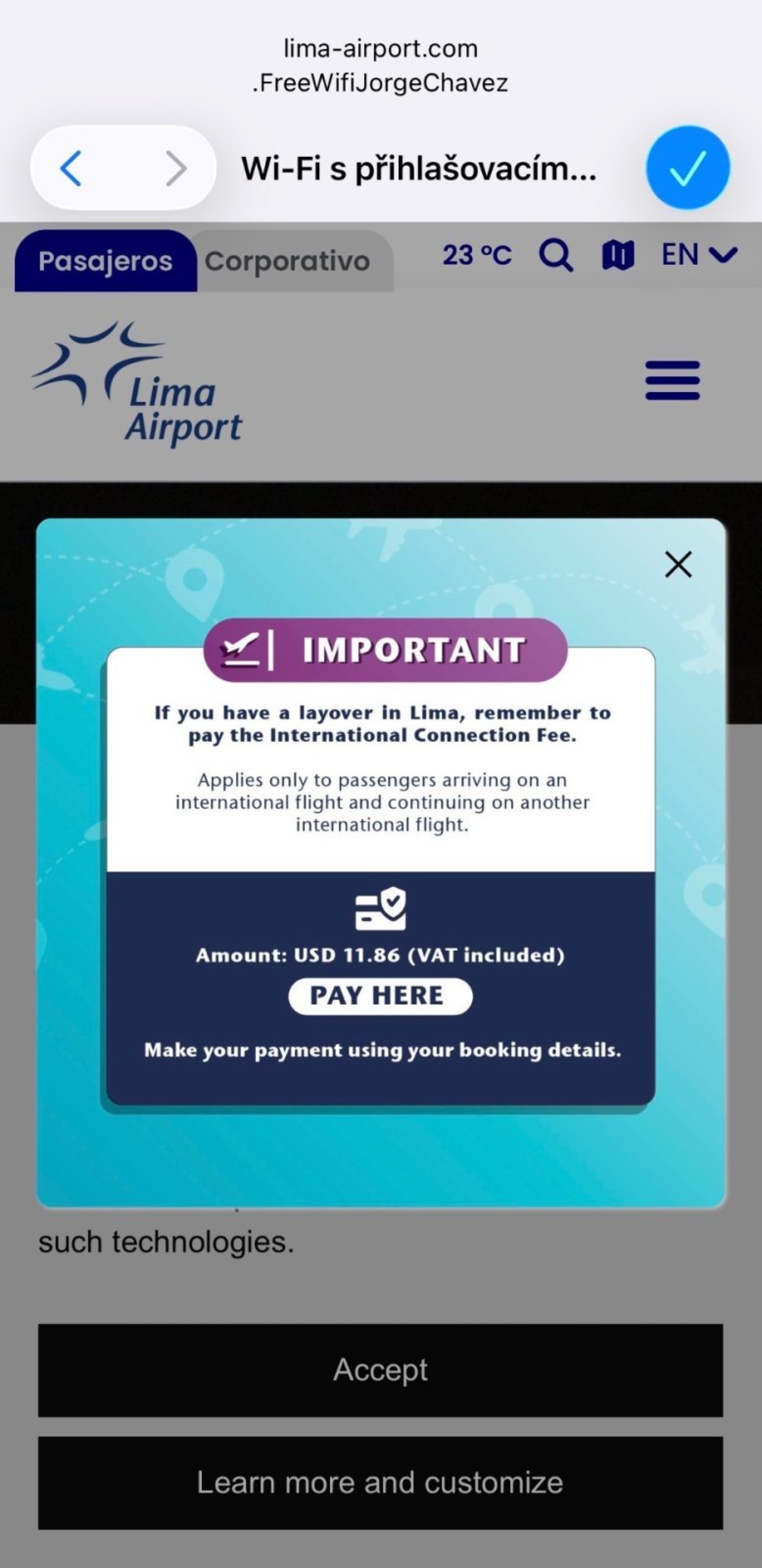 Niestety, lotnisko w Limie (LIM) pobiera opłatę tranzytową (TUUA) w wysokości 11,86 USD od lotów łączonych od 7.12.2025.