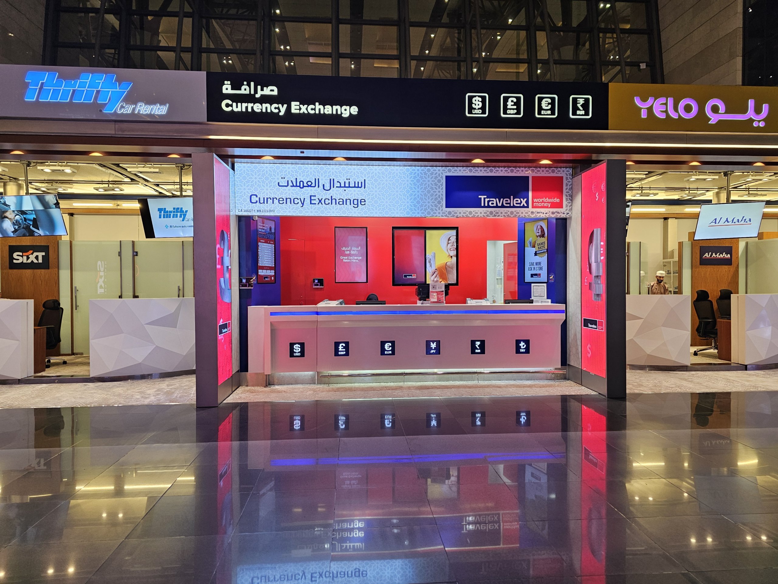 Kantory wymiany walut na lotnisku są obsługiwane przez Travelex i Global Money Exchange z niekorzystnymi kursami.
