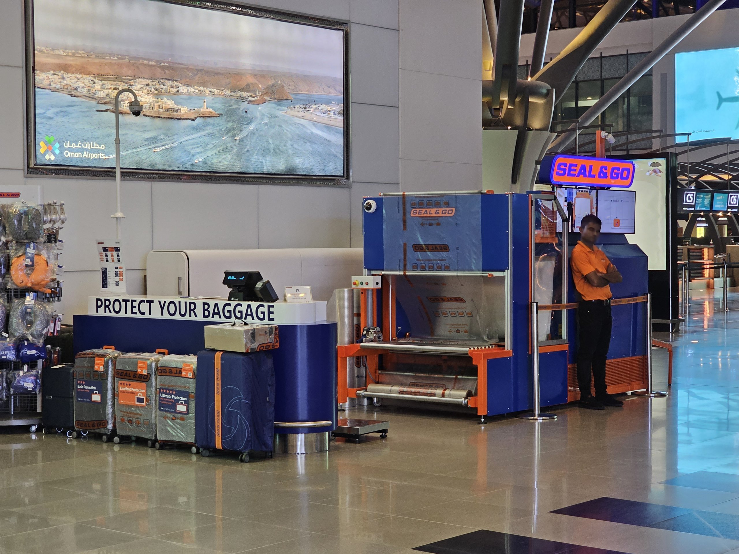 W hali odlotów znajduje się kilka kiosków, w których można zapakować bagaż w folię ochronną za opłatą od 3 omr do 6 omr (w zależności od wielkości walizki).