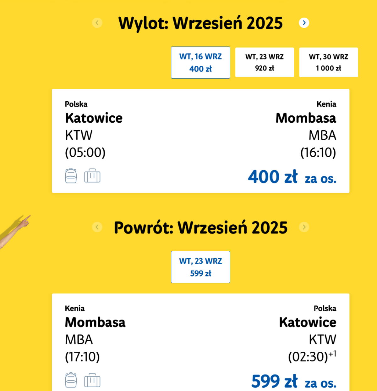 Polskie biuro podróży Rainbow oferuje bezpośrednie loty czarterowe z Katowic do Mombasy w bardzo przystępnych cenach - bilety w dwie strony można kupić już na od 1 799 pln.