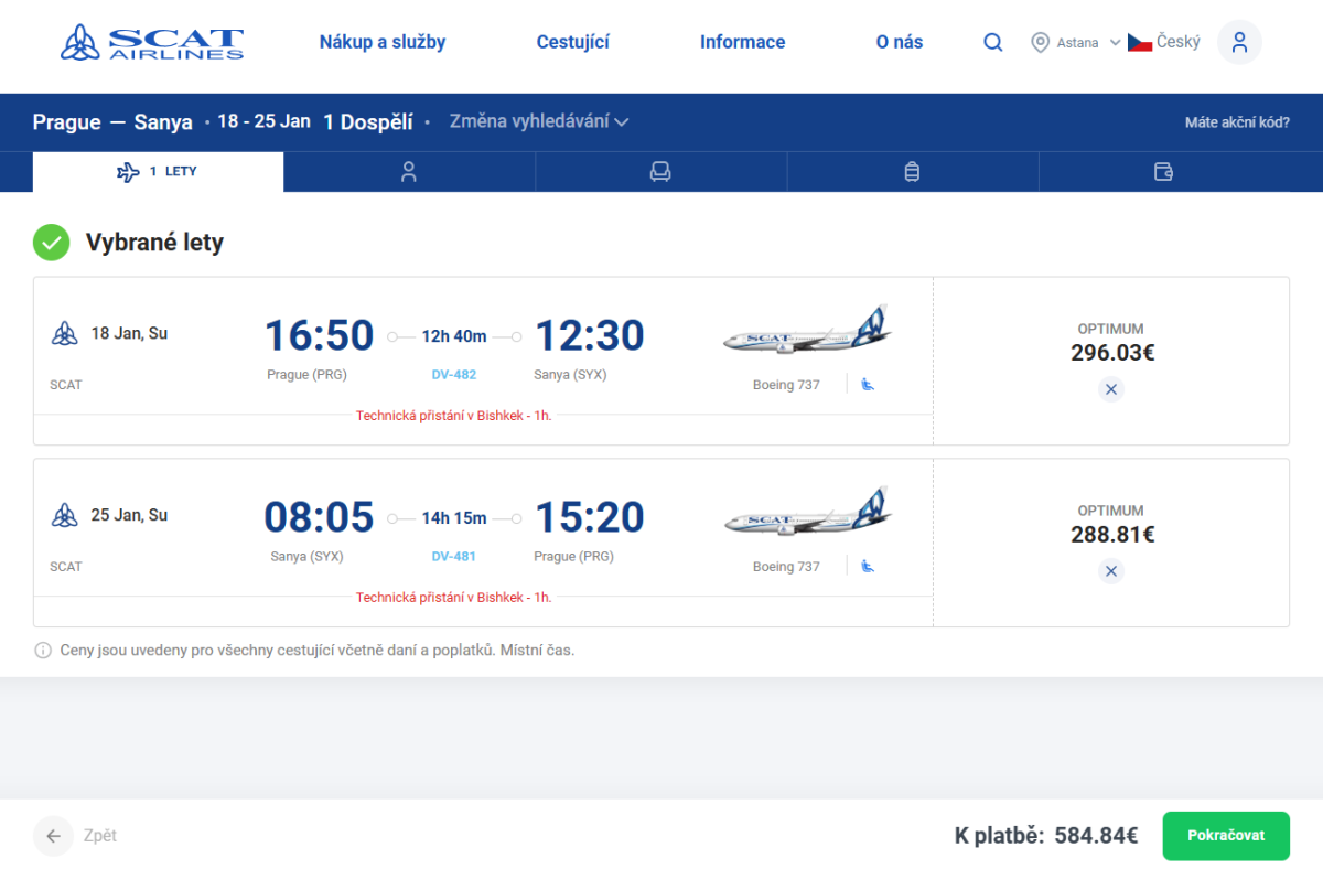 Loty obsługiwane są przez SCAT Airlines na pokładzie Boeinga 737 MAX 9. Jest tylko krótkie międzylądowanie techniczne w Biszkeku w Kirgistanie, podczas którego pozostaje się na pokładzie.