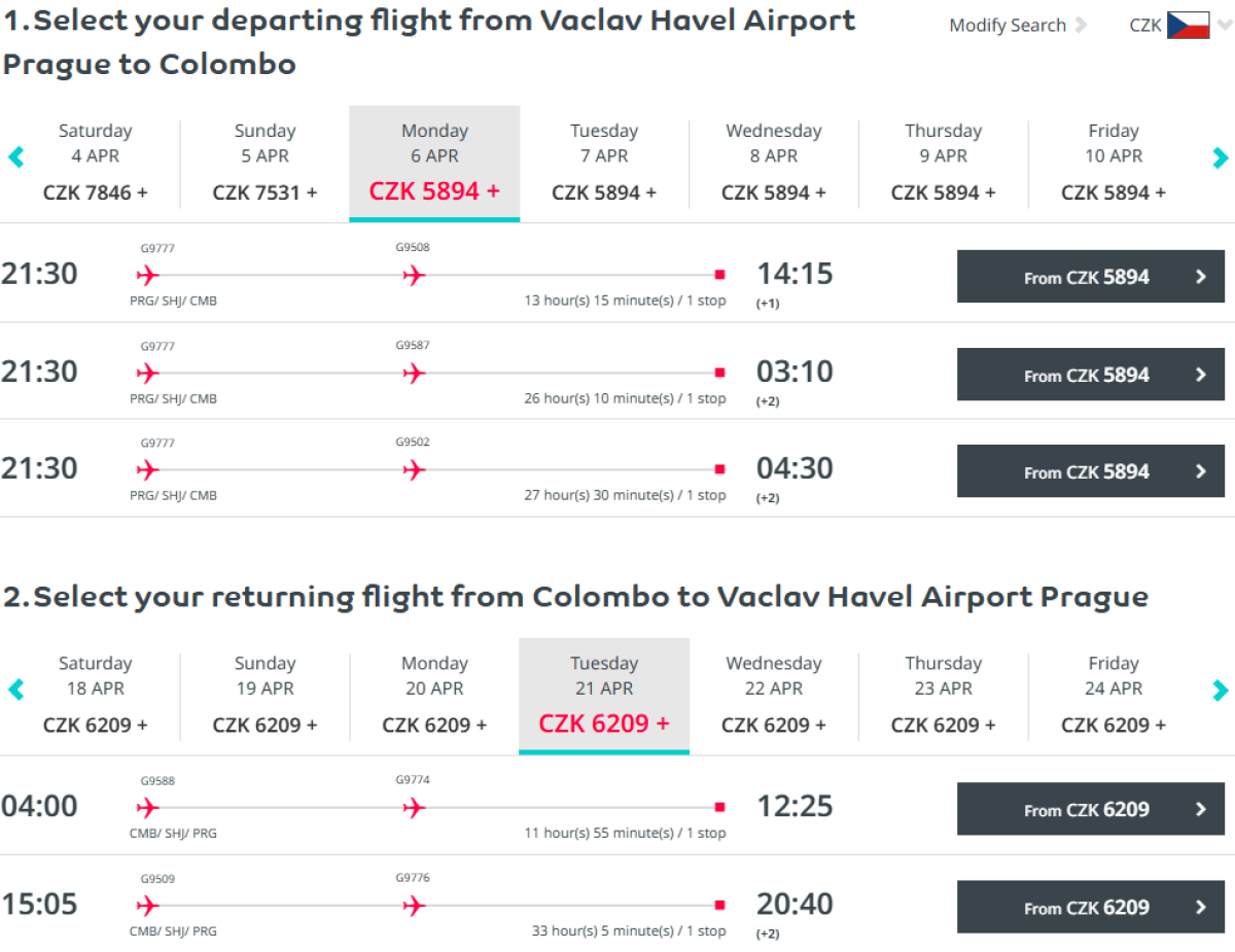 Na pierwszy rzut oka największe wrażenie zrobiły na nas loty w dwie strony z Pragi do Kolombo na Sri Lance za 499 euro na prawie każdy dzień kwietnia.