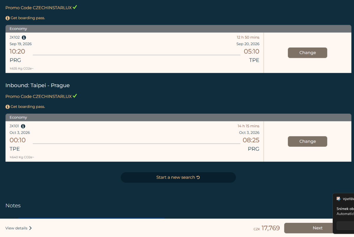 Tajpej - Praga: 00:10-07:50