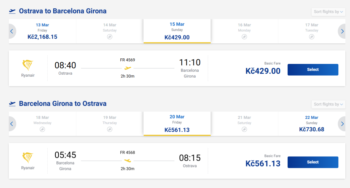 Najtańsze bilety dostępne są obecnie w terminie 15-20 marca (niedziela-piątek) w cenie 41 euro. W marcu loty z Ostrawy odbywają się w piątki i niedziele, ale należy spodziewać się bardzo wczesnego lotu powrotnego - wylot z Girony zaplanowany jest na godzinę 5:45.