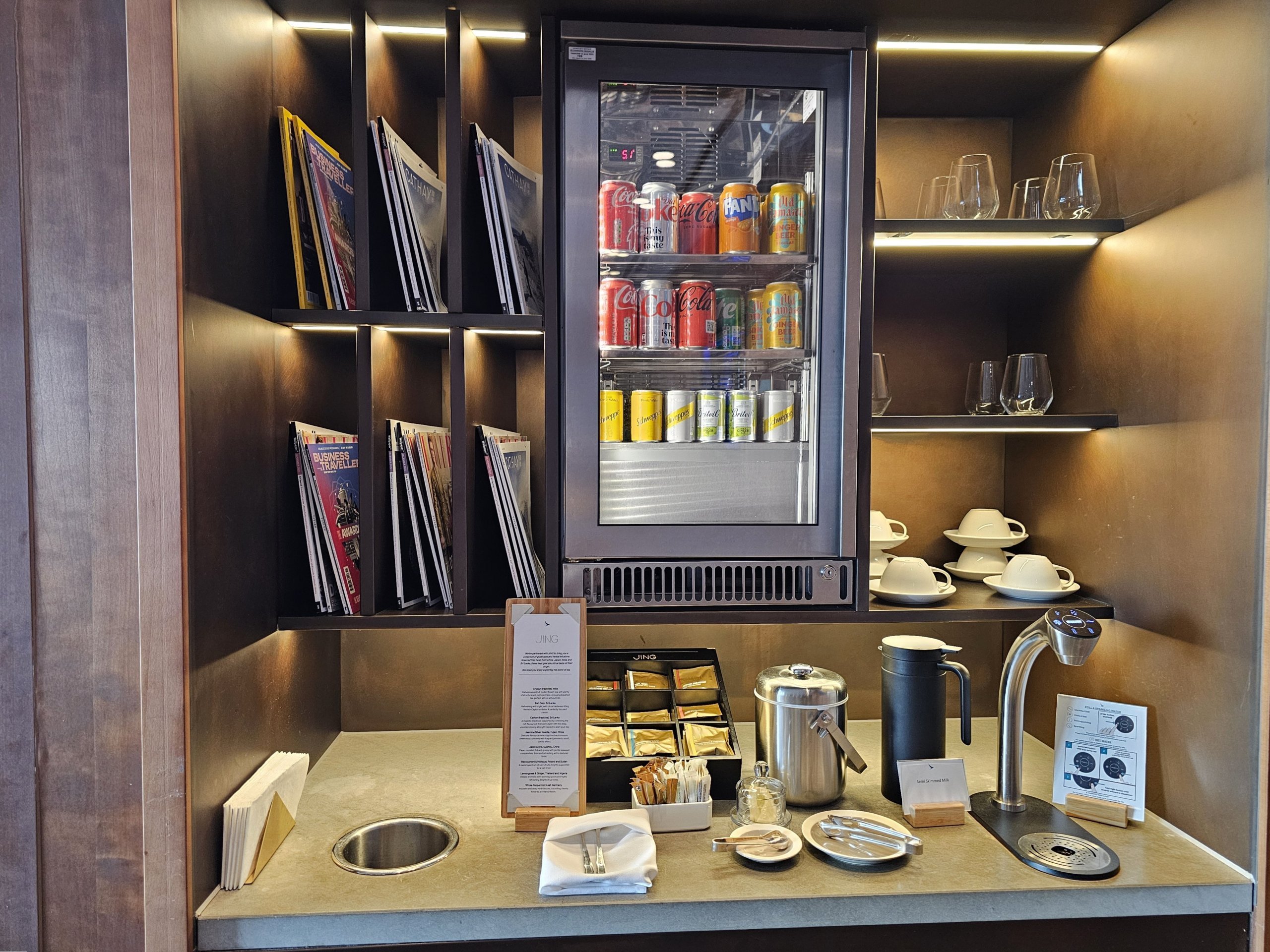 W różnych miejscach w salonie znajdują się ekspresy do kawy i dość szeroki wybór herbat Jing.