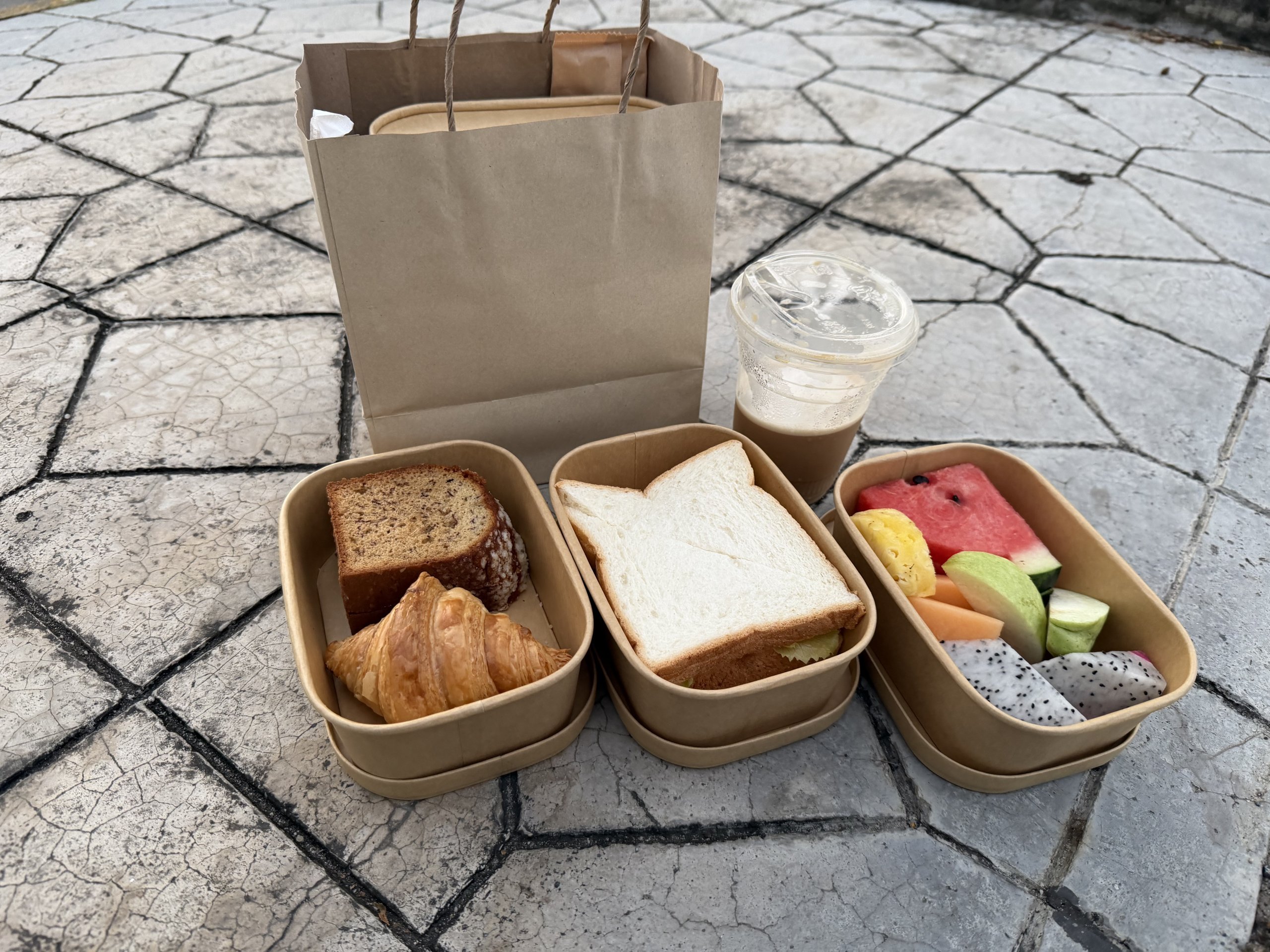 Recepcja zaoferowała nam opcję samodzielnego przygotowania śniadania na wynos. Zestaw zawierał kawę, dwa tosty i owoce. Dość podstawowe, ale wystarczające na wczesny poranek i bardzo miły gest.