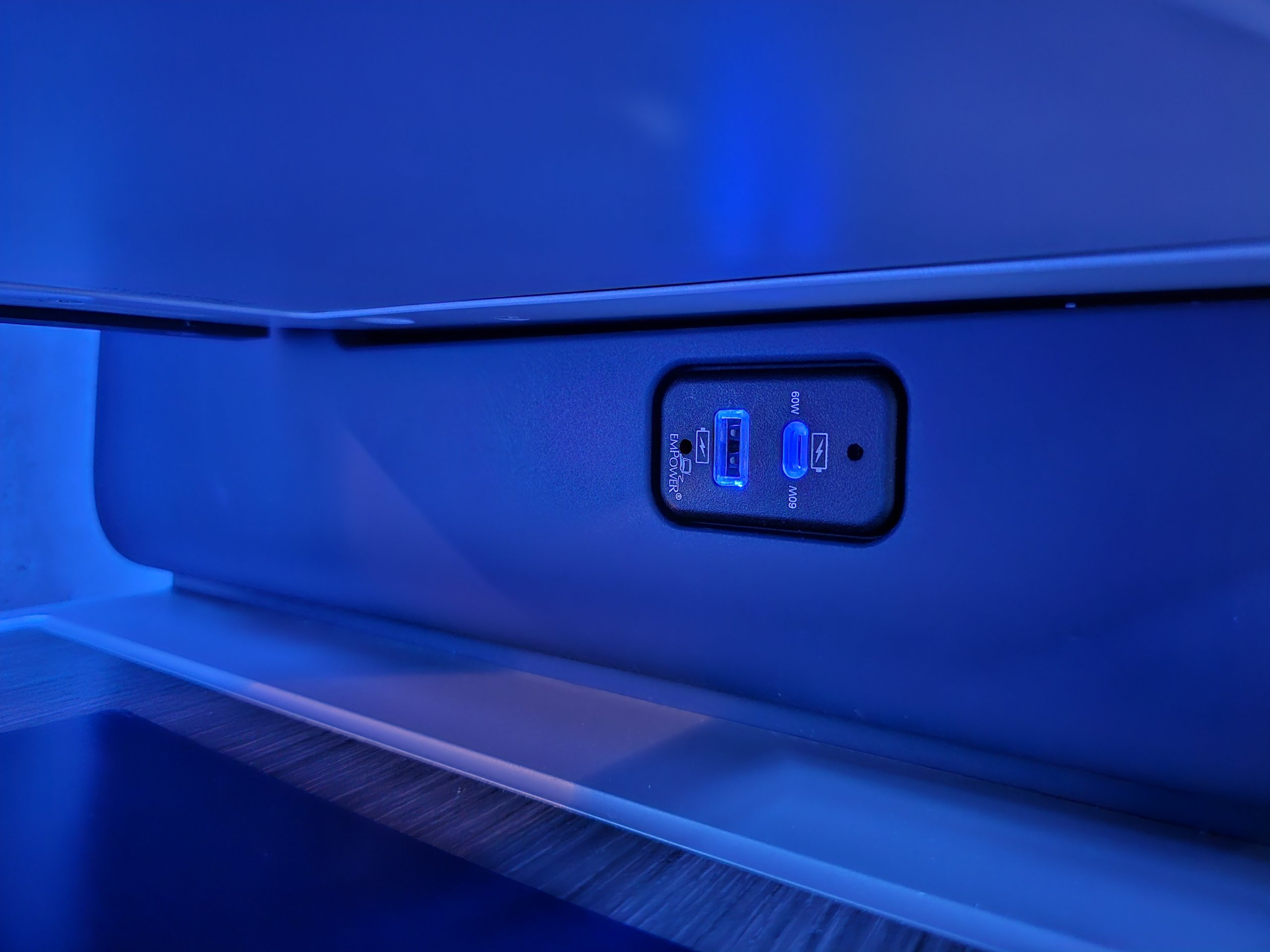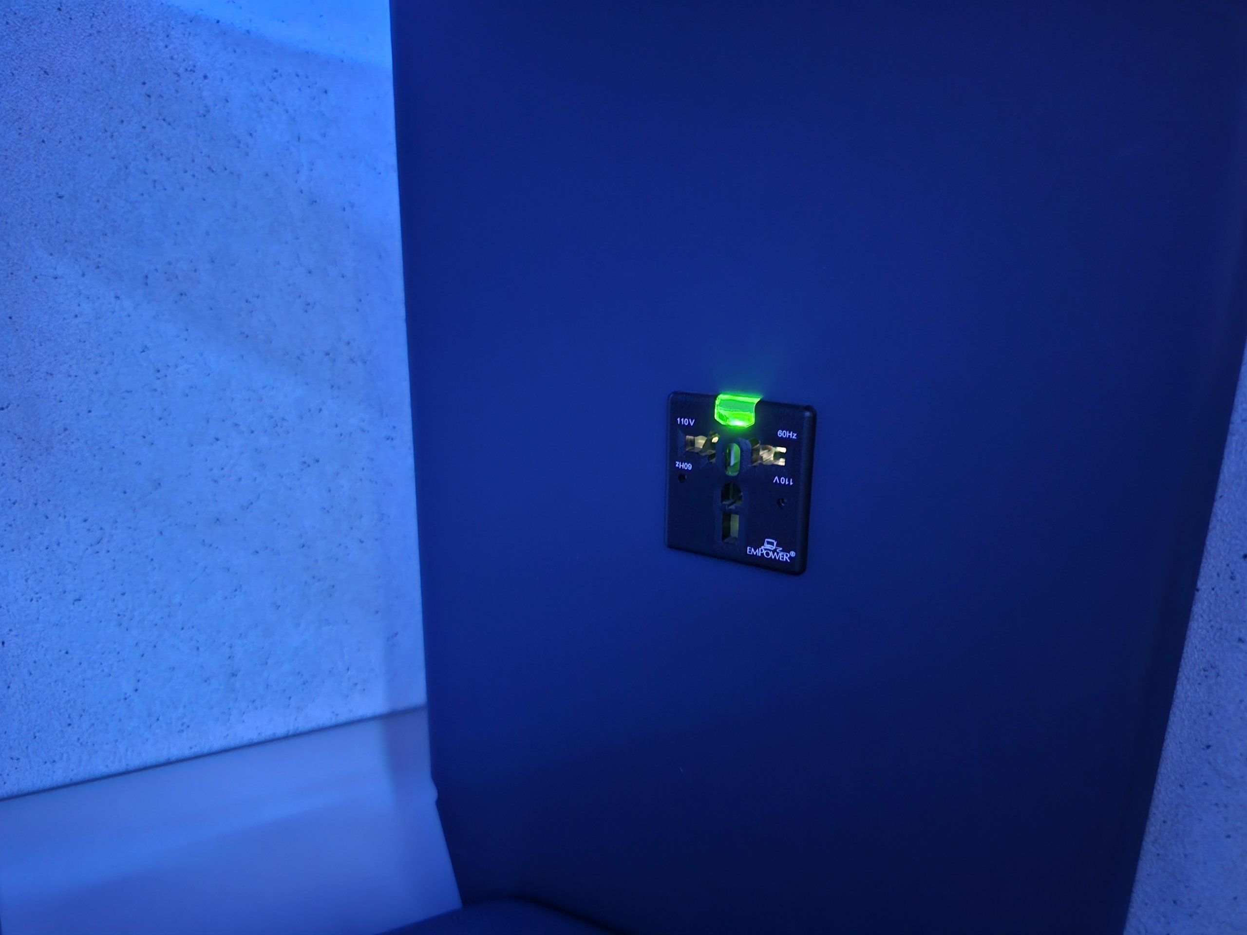 Elegancką atmosferę podkreśla niebieskie nocne oświetlenie, ponieważ nasz lot odlatuje o 4:35.