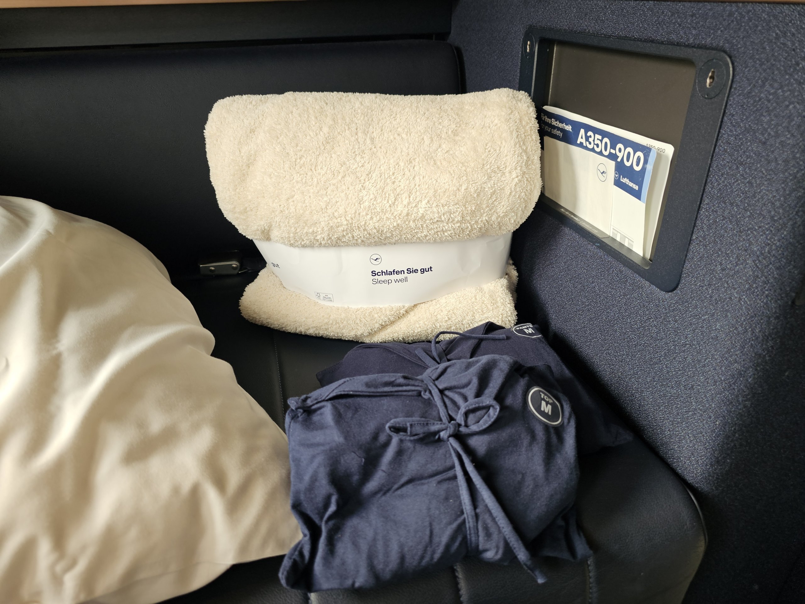 Fotel wyposażony jest w niezwykle wygodną poduszkę i koc, z których można korzystać w dowolnym momencie lotu. Do spania pasażer otrzymuje od załogi kolejny koc i pościel.