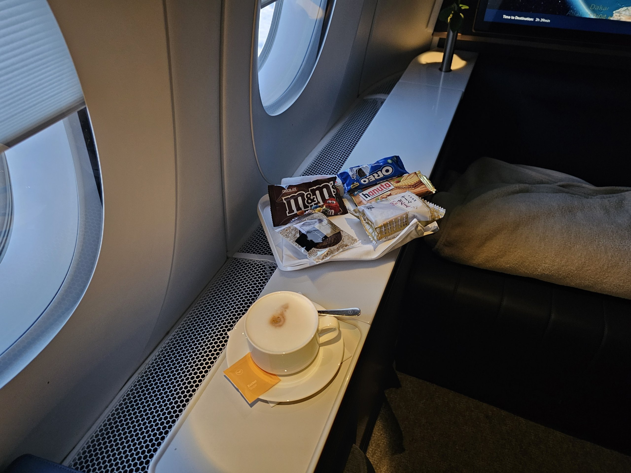 Oferta śniadaniowa jest nieco uboga, ale nie przeszkadza mi to, ponieważ z lotów z Frankfurtu do Japonii wiem już, że obsługa w klasie pierwszej Lufthansy jest więcej niż wystarczająca.
