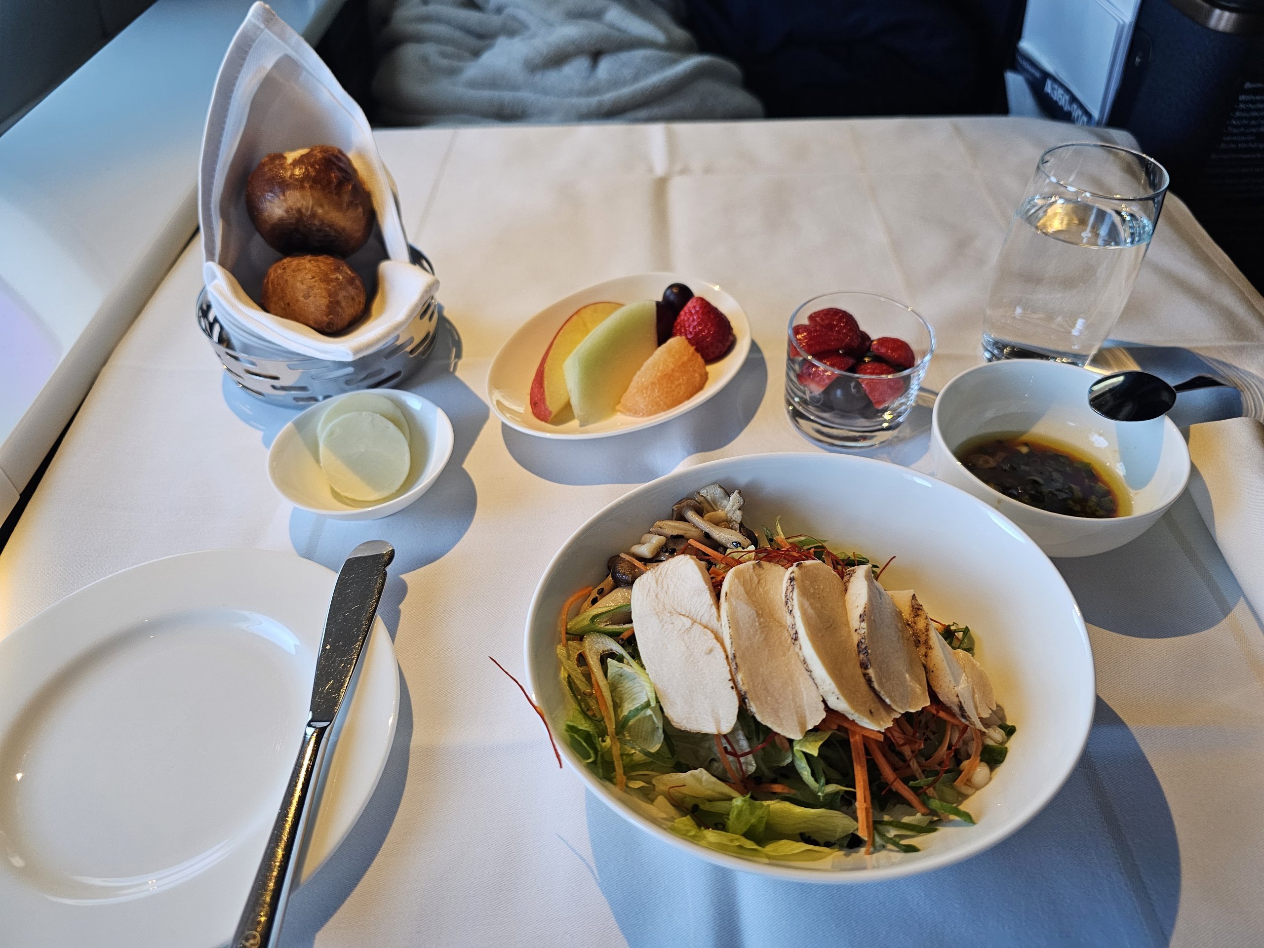 Przystawka jest bardzo świeża, kolorowa, lekka i wyśmienita! Podoba mi się prezentacja, a w porównaniu z klasą biznes jedzenie jest bardziej obfite i zróżnicowane.