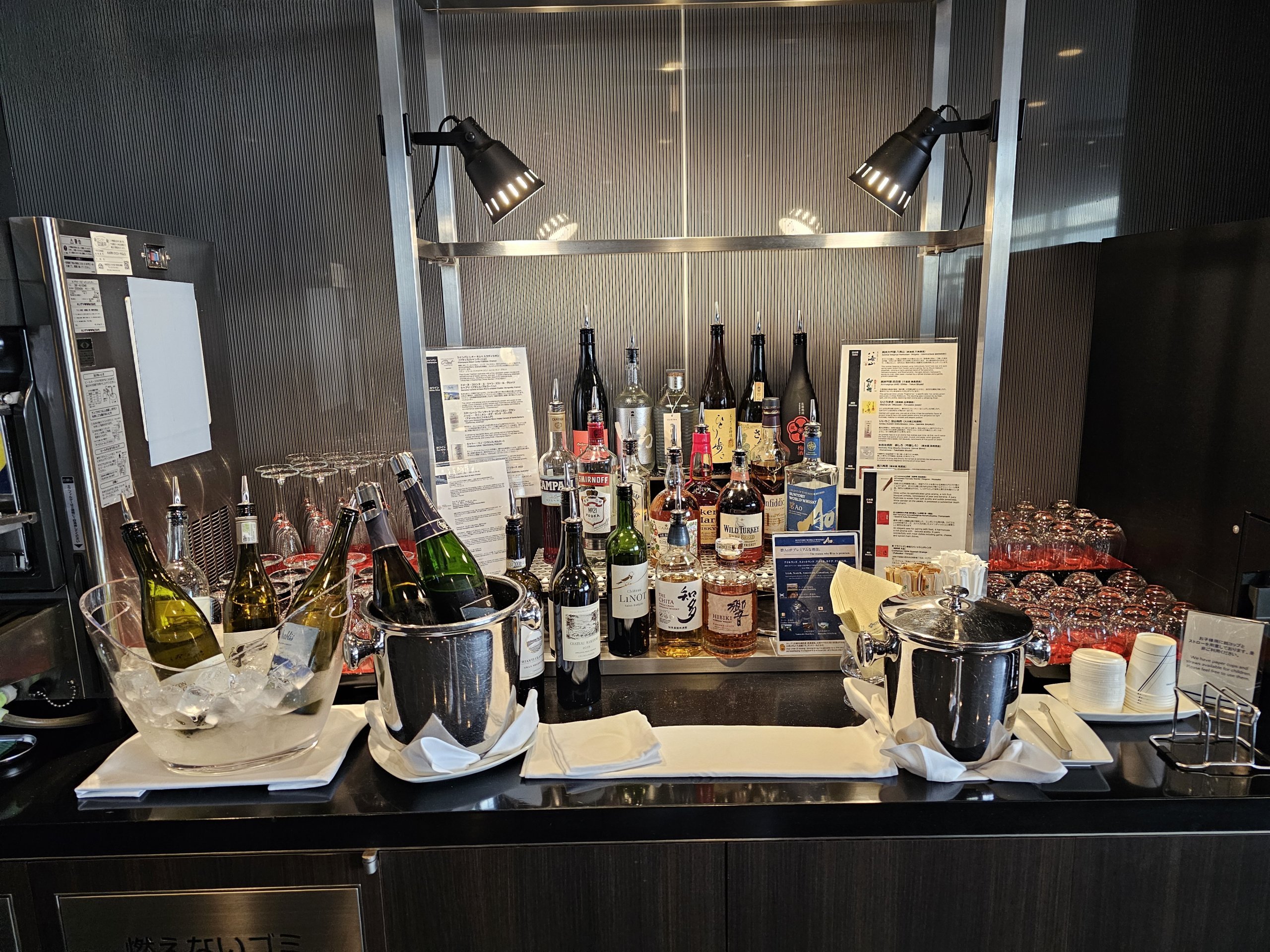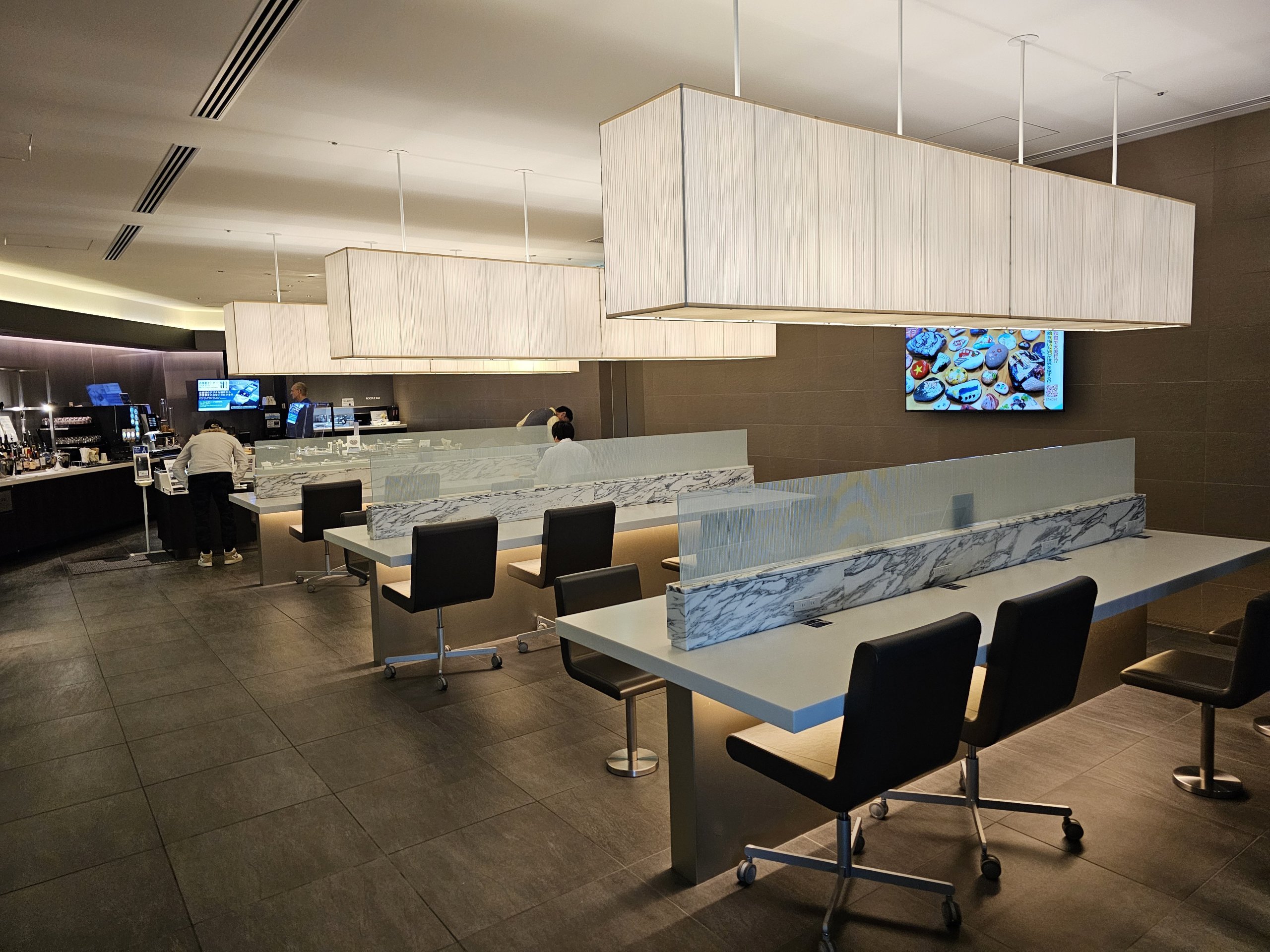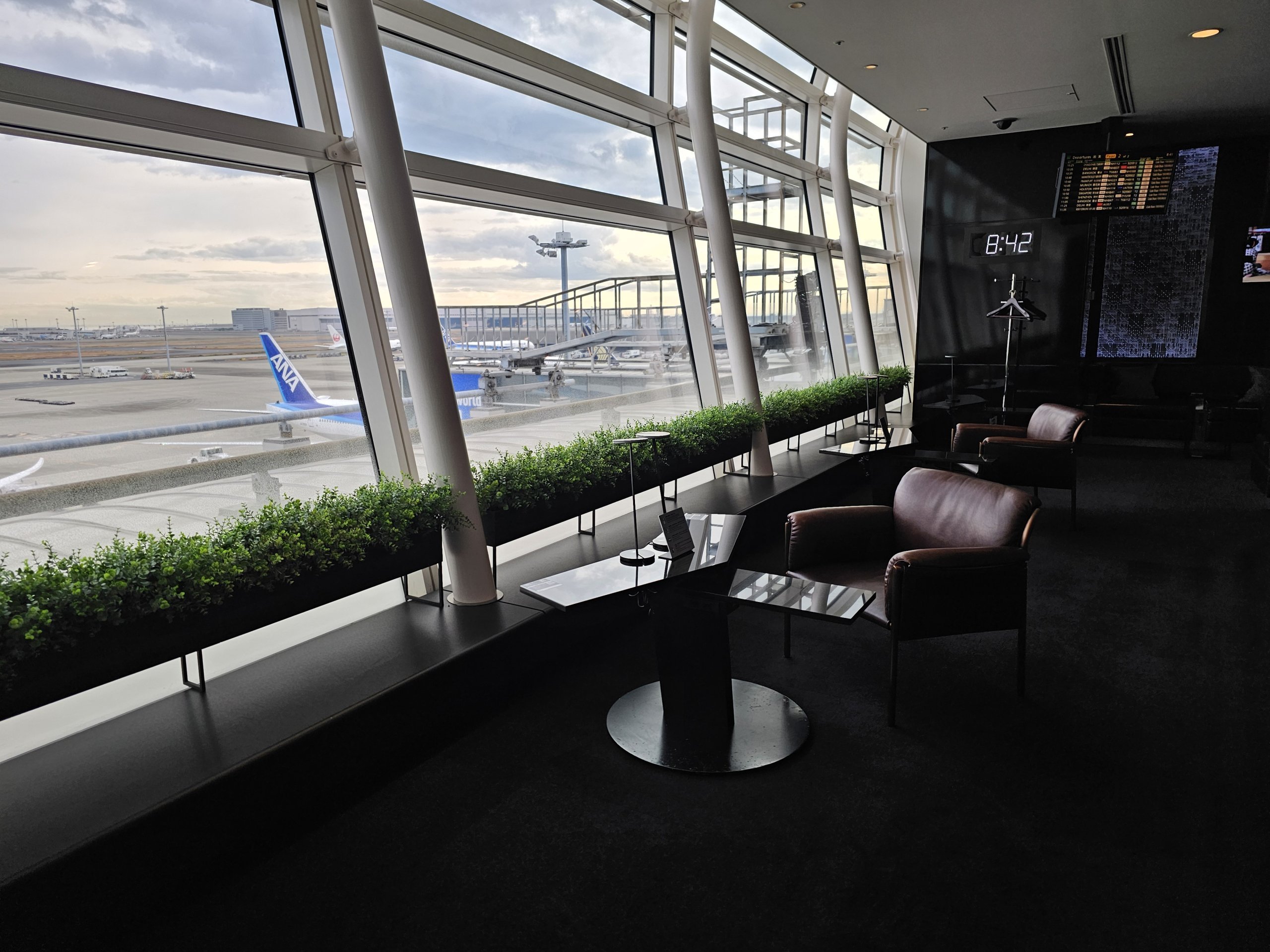 Salonik jest bardzo przestronny, z doskonałym widokiem na płytę lotniska i dużą liczbą kabin, które naśladują fotele pierwszej klasy w ANA Japan Airlines.