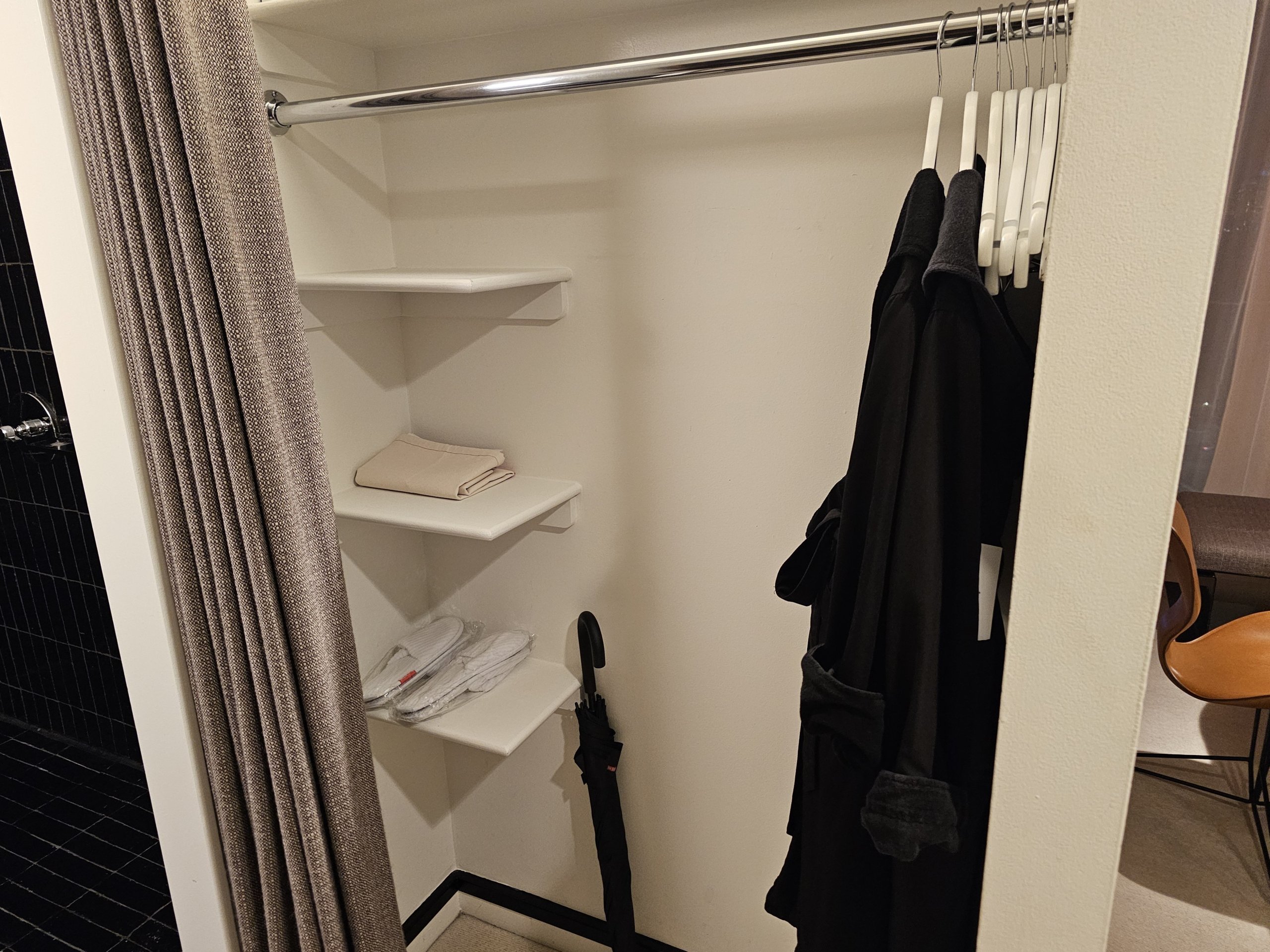 Jest bardzo mało miejsca do przechowywania, praktycznie tylko jedno biurko z sofą i "szafa" za zasłoną z kilkoma wieszakami. Poza tym nic.